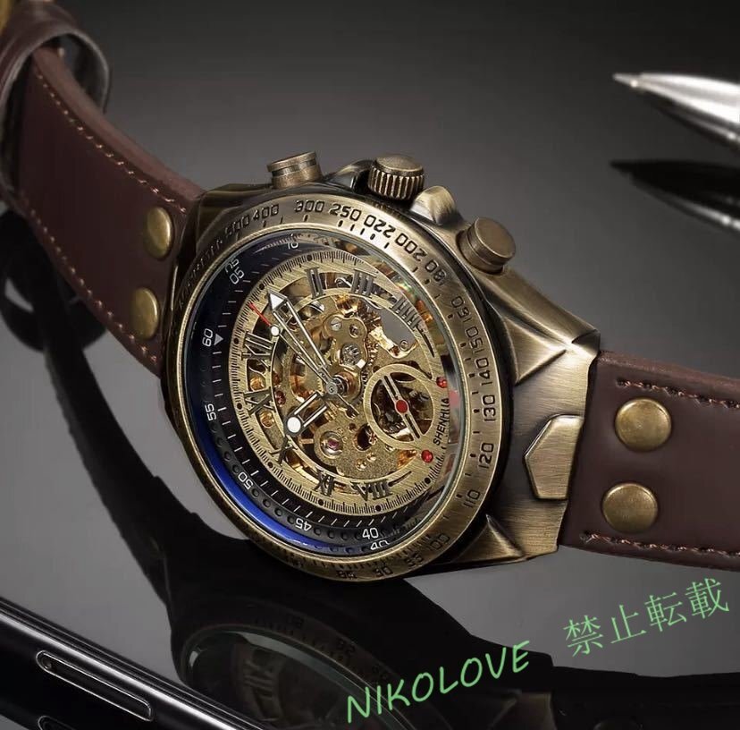 - 新品 メンズ腕時計 機械式 時計 男性 自動 スケルトン ブロンズ 革 スチーム パンク 透明 LA809