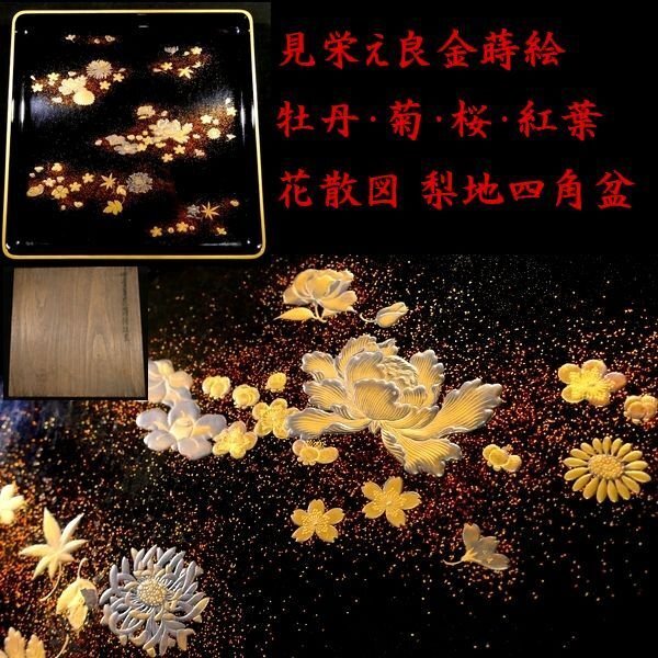 - 【 恵 #1470】 見栄え良き牡丹・菊・桜・紅葉 花散金蒔絵 梨地 四角盆 保管箱有 検:漆芸/漆器/茶道/茶道具/書道/書道具/