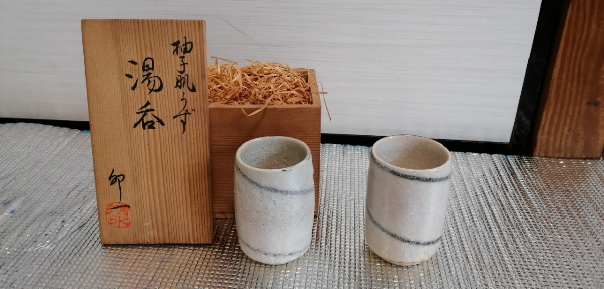 - 未使用 清水卯一 柚子肌うず 湯呑 2個 ペア セット 三浦 竹軒