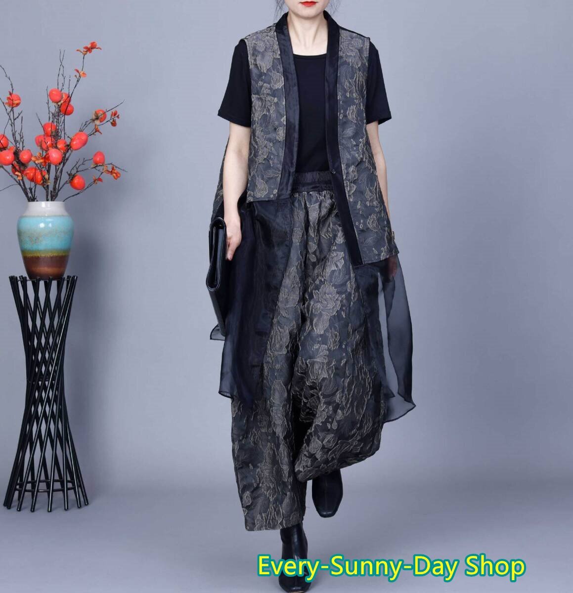 - 裾不対称ロングベスト&パンツ2点セット ズボン 綿ポリエステル混 織り込み花柄 フリーサイズ ゆったり オシャレ 大人可愛 灰