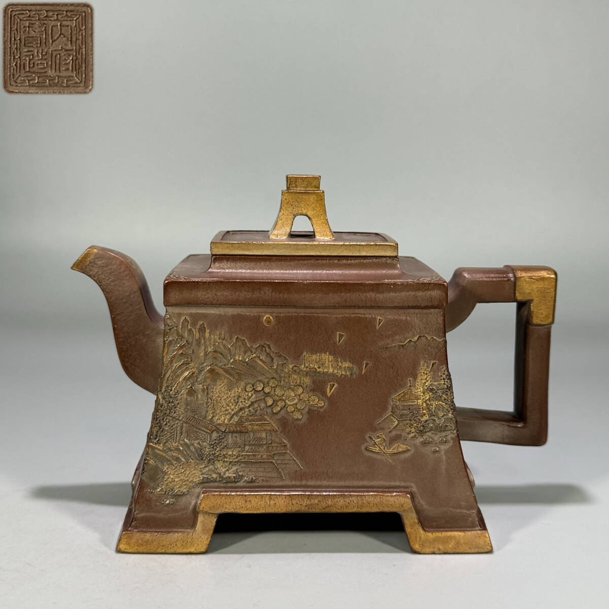 - 古陶芸 紫砂壷 清時代 【内府督造】 在銘 「堆金彩絵升方壺」 段泥 煎茶 急須 茶道具 唐物 時代物 茶器 容量400cc LT-250128