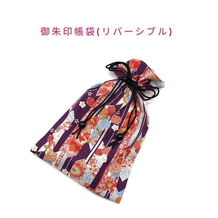 - 御朱印帳袋・リバーシブル【和柄 矢羽根花柄/麻の葉柄 パープル】+超ミニ巾着袋(お守り袋)つき!巾着袋 日本製 ポーチ 矢絣 花柄 古希