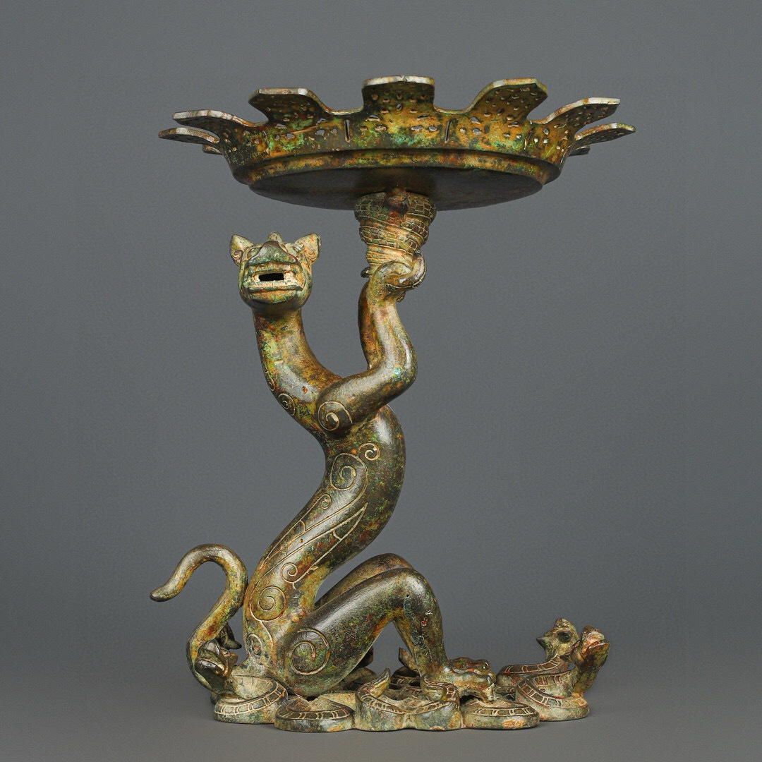 - 【超珍館蔵】漢 青銅製 盤龍燈 置物 古賞物 古美術品 稀少珍蔵品