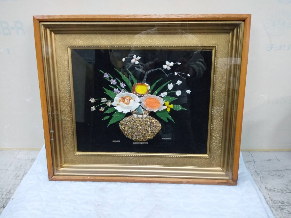 - 0718-0018 中古★貴石画 宝石画 花図 額装 昭和レトロ 天然石絵画 天然石 花絵 伝統工芸品 美術品 アンティーク品 ビンテージ品