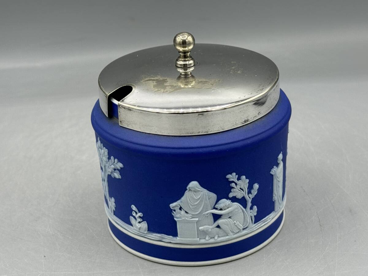 > 英国 ウェッジウッド ジャスパーウェア 紺 ネイビー ブルー シュガーポット ジャスパー シルバープレート (765)