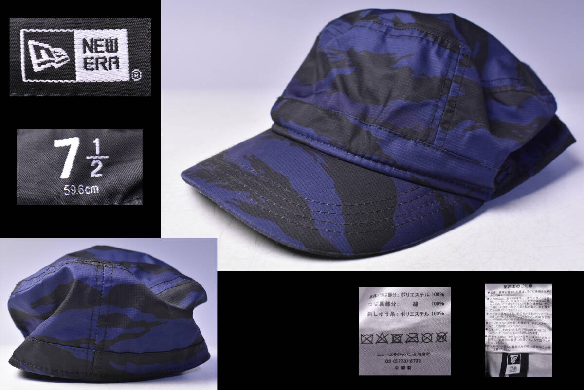 > NEW ERA ★ ニューエラ ★ ワークキャップ ★ 青x黒 迷彩柄 ★ 7 1/2 ★ 59.6cm ★ ポリエステル ★ 帽子 ★ 中古品 ★