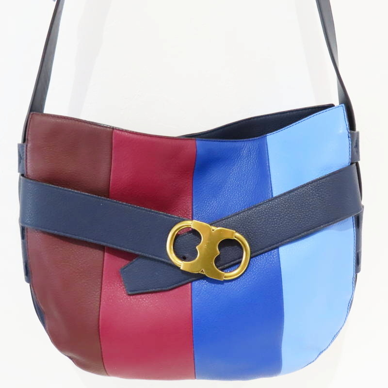 > M12-k045 TORY BURCH トリーバーチ ジェミニリンク ベルトバックル レザーショルダーバッグ ブラウン/ネイビー