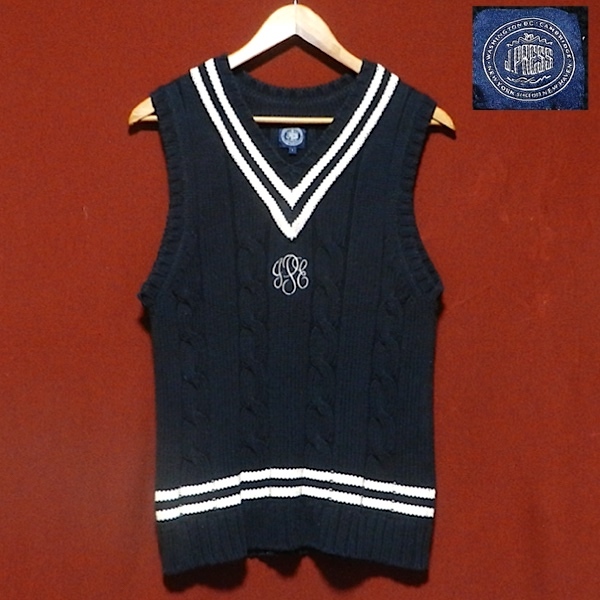 > J.PRESS Jプレス ジェイプレス 縄編み ケーブル編み Vネック 厚手 コットン ニット セーター チルデン ベスト ボーダー 黒 / 白 L 美品