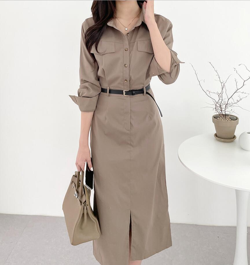 - 2024春季/ワンピース 長袖 きれいめ ロングワンピース ベルト付き ロング丈 着痩せ 入学式 卒業式 入園式 通勤ワンピース/カーキ
