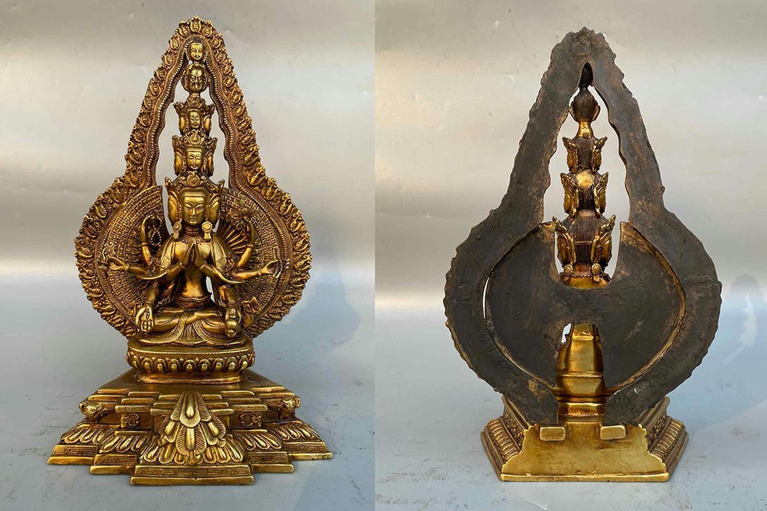 > ▼渡鶴羽▼P004清時代 仏教古美術 チベット密教 銅塗金千手観音菩薩仏像 細工彫刻★仏教古美術★仏像★細密細工★廃寺旧蔵★廃寺買出品