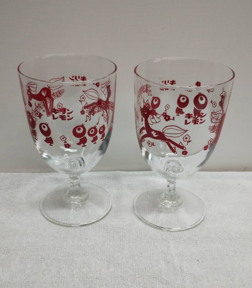 > キリンレモン KIRIN LEMON ユニコーン 脚付きグラス ゴブレット 2個セット 赤 ひよこ 小鳥 昭和レトロ ポップ 現状品