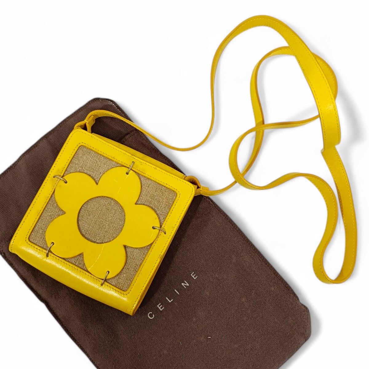 - 正規品 セリーヌ CELINE ミニ ショルダーバッグ ポーチ 花 レザー 黄色 フラワー 保存袋付き 肩掛け 斜め掛け 小さめ鞄 かばん レトロ