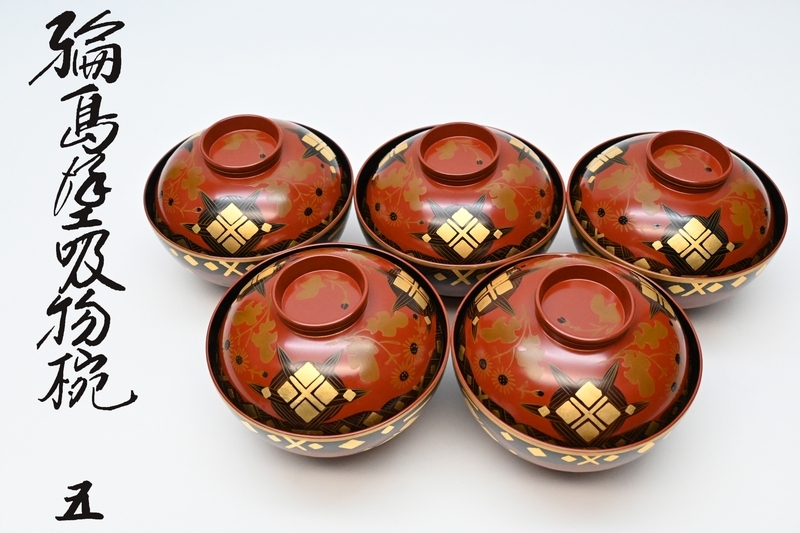 - 輪島塗 秀衡椀 ■ 高級 吸物椀 秀衡模様蒔絵 金彩 切り金箔 五客 ■ 未使用 天然木 懐石 茶道具 共布 木箱入■