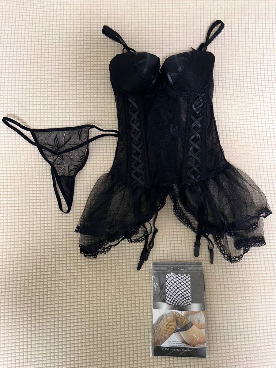 - ランジェリー ガーターベルト付スリーインワンビスチェ 黒レース ショーツ・網タイツ付 Mサイズ