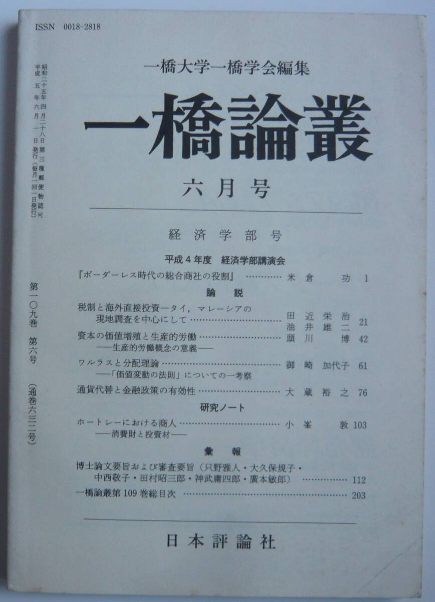 - 【入手困難本!】【古書】『一橋論叢 第109巻/第6号(通巻632号)』一橋大学一橋学会編集 日本評論社