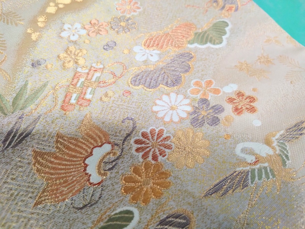 - ●2【吉祥平安小袖】ゴールド 高級 袋帯 松竹 鶴 花鳥 金彩 輝き 光沢 煌 雅 豪華絢爛 六通 帯 縁起物 松竹梅 鶴 桐 小槌 中古 ③
