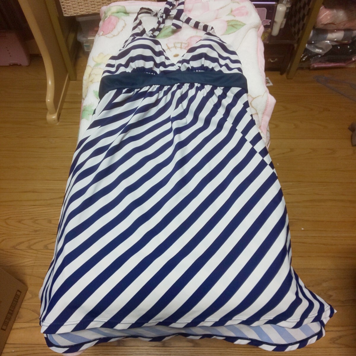 - 青と白のストライプスカート水着Lサイズアンダー無し裏地無し