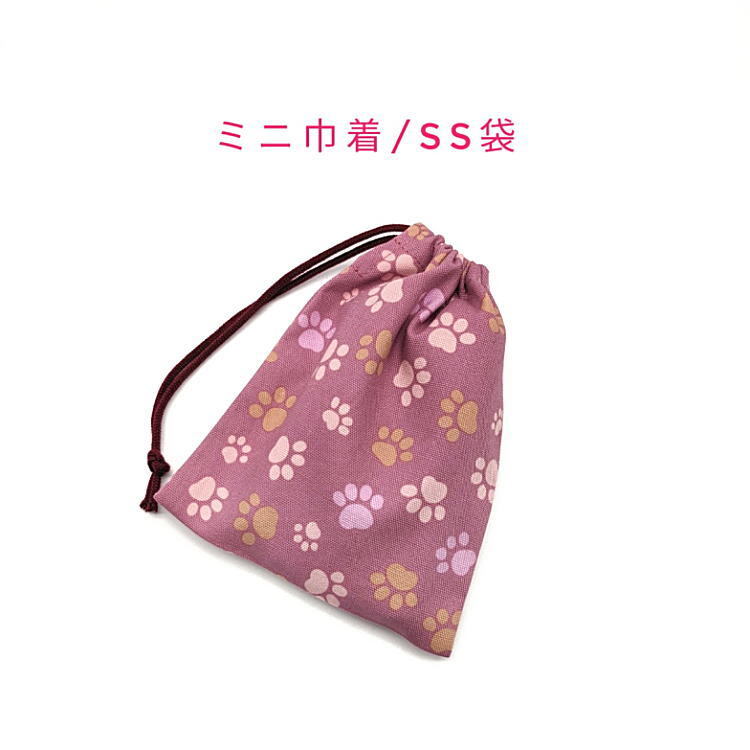 > ミニ巾着袋・SS袋【くすみカラー 足あと柄 ピンク】マチ無し 日本製 巾着 ポーチ 小物入れ 小さい袋 肉球 足跡 犬 イヌ 猫 ネコ アニマル