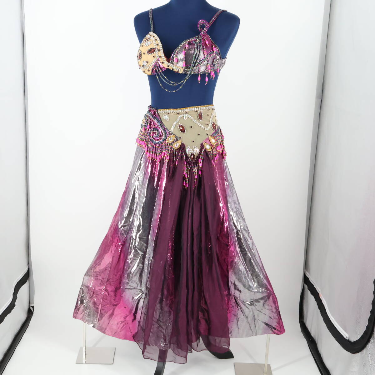 - 『送料無料』【ベリーダンス用 オリエンタル衣装】ワインレッド ラインストーン×ビーズ 豪華 紫 小豆色 ピンク シルバー 光沢 艶 華やか