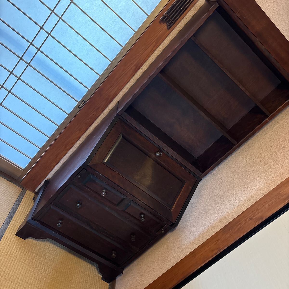 - 中古*北海道民芸家具 ライティングビューロー 飾り棚 カバ/樺材 ライティングデスク 文机 学習机 棚付き 和モダン キャビネット 北民