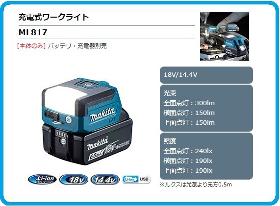 - マキタ 14.4V/18V 充電式ワークライト ML817 (本体のみ)[バッテリ・充電器別売]■安心のマキタ純正/新品/未使用■