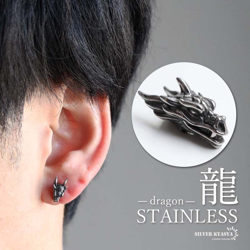 - ステンレス ドラゴンピアス 龍 スタッドピアス ワンポイント シルバー 燻し 個性的 片耳 メンズ 男性 金アレ対応