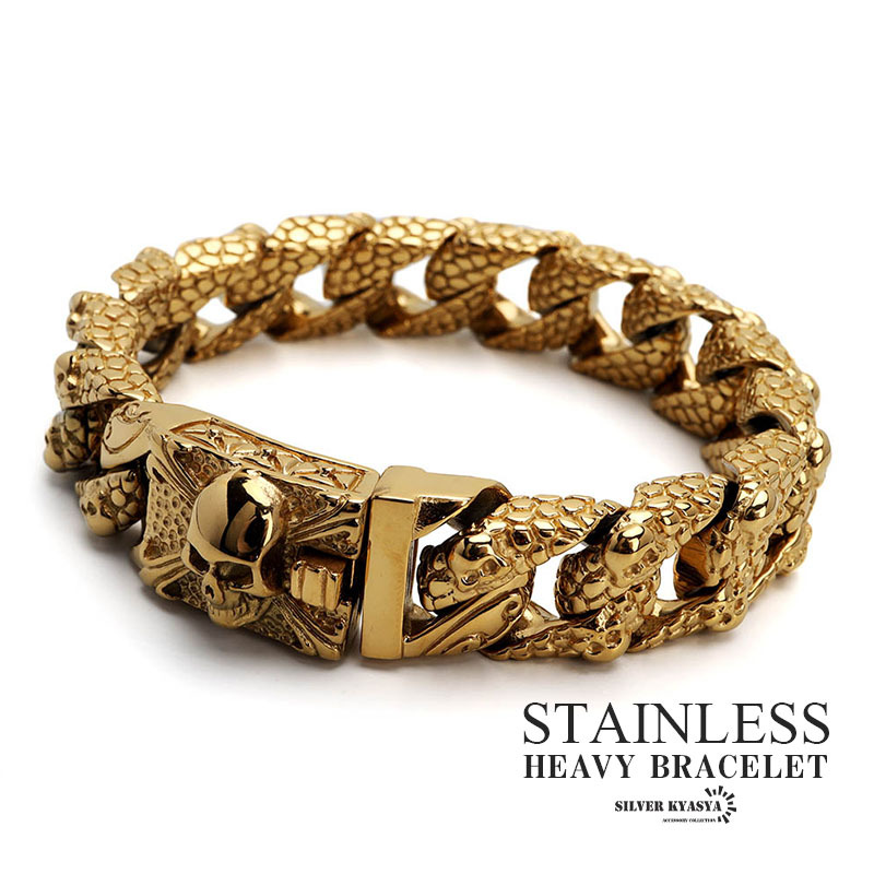 > 重厚 チェーンブレスレット スカル 喜平チェーン ゴールド 金 ステンレス 316L 喜平ブレスレット ごつめ ワイドブレスレット