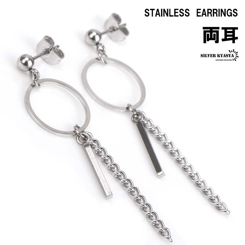 - 両耳 ステンレスピアス シルバー チェーン スティック リングピアス 個性派ピアス