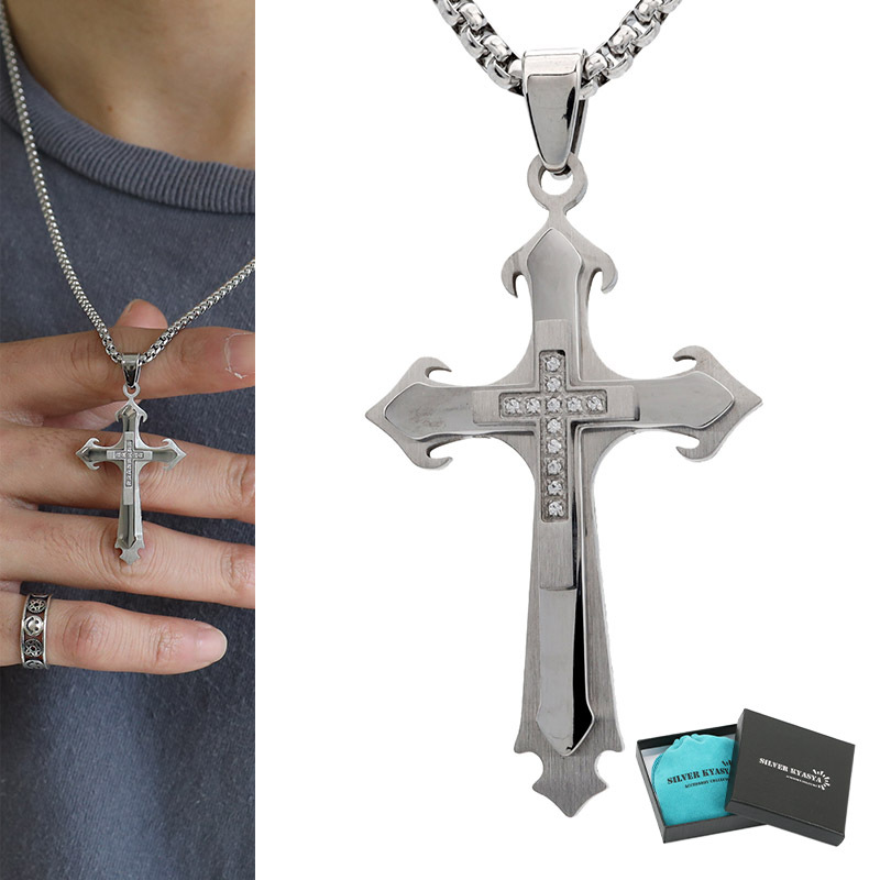- 三層構造 機械美 クロスネックレス シルバー 十字架 メンズネックレス ステンレス ストーン付き チェーン付き 専用BOX付属