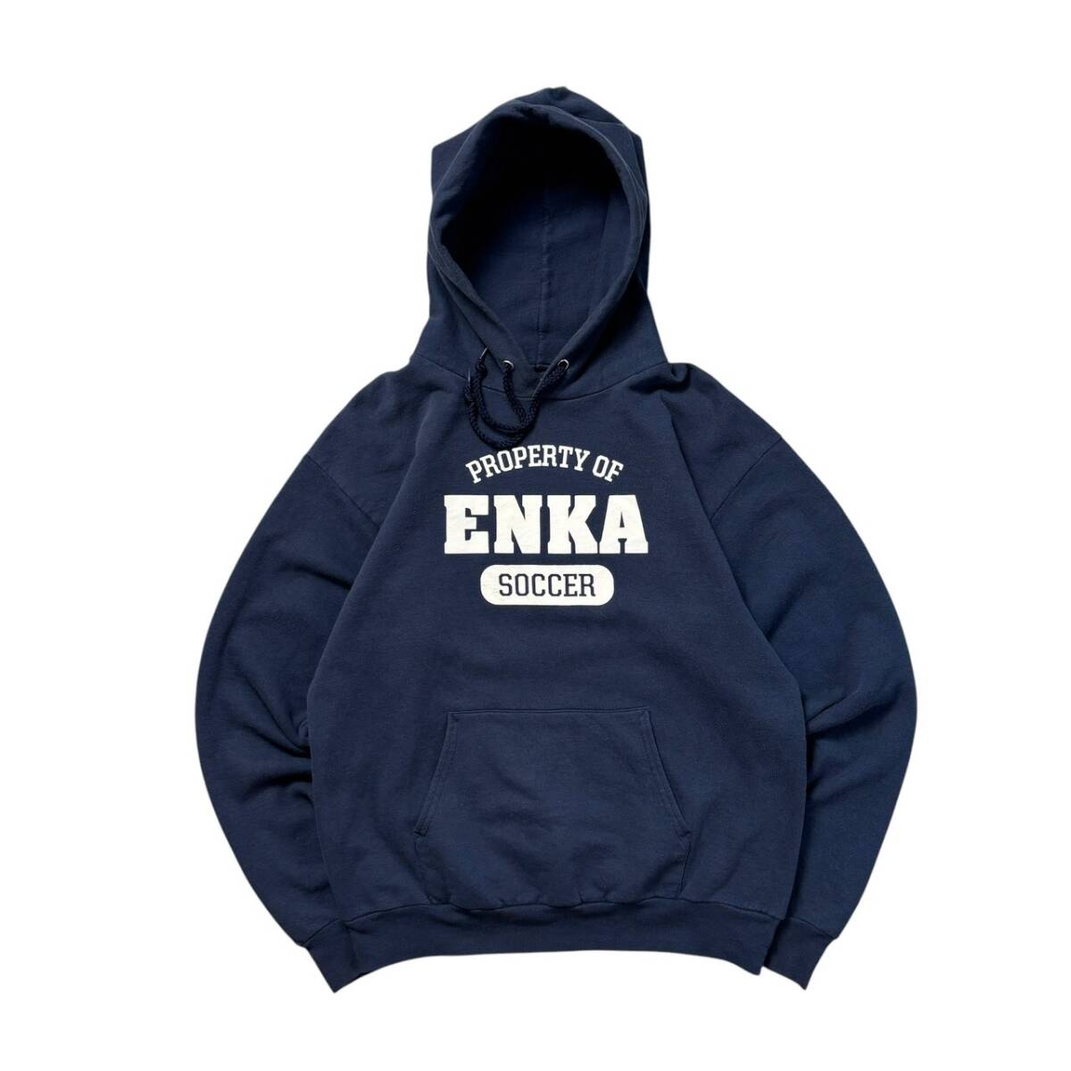 - M 古着 Hanes ヘインズ パーカー カレッジロゴ 3段 プリント カプセル サッカー プルオーバーパーカー スウェット 裏起毛 紺 ネイビー