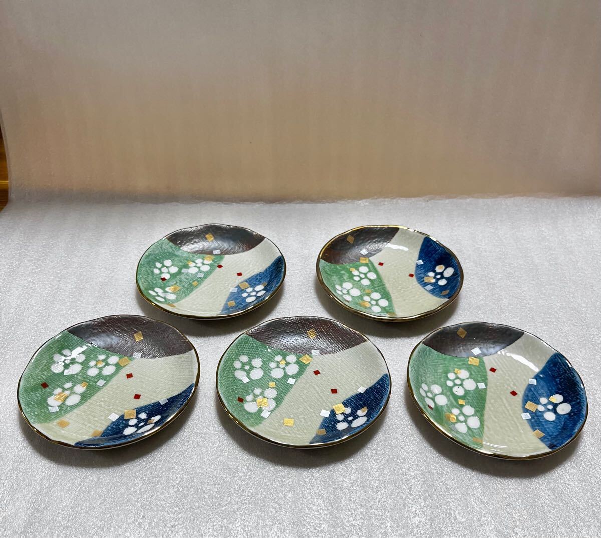 - 未使用 新品 有田焼 嵯峨 金彩 絵皿 銘々皿 小皿5枚 和食器 丸皿 梅 ブルー グリーン 5客 セット