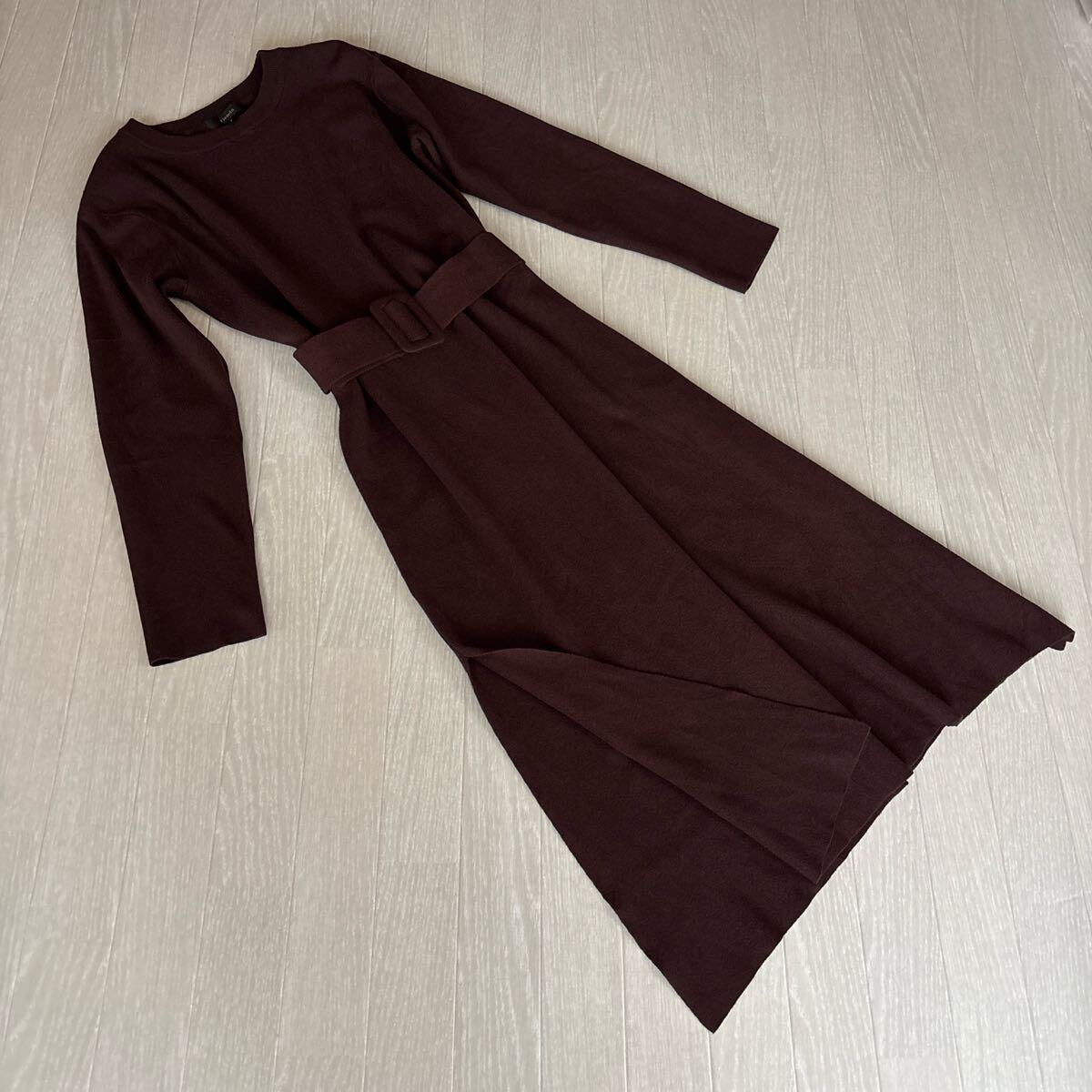 - リエンダ フリーサイズ ダークブラウン 長袖 ニットロングワンピース ベルト付き rienda 長袖ワンピース スリット こげ茶 クルーネック 冬