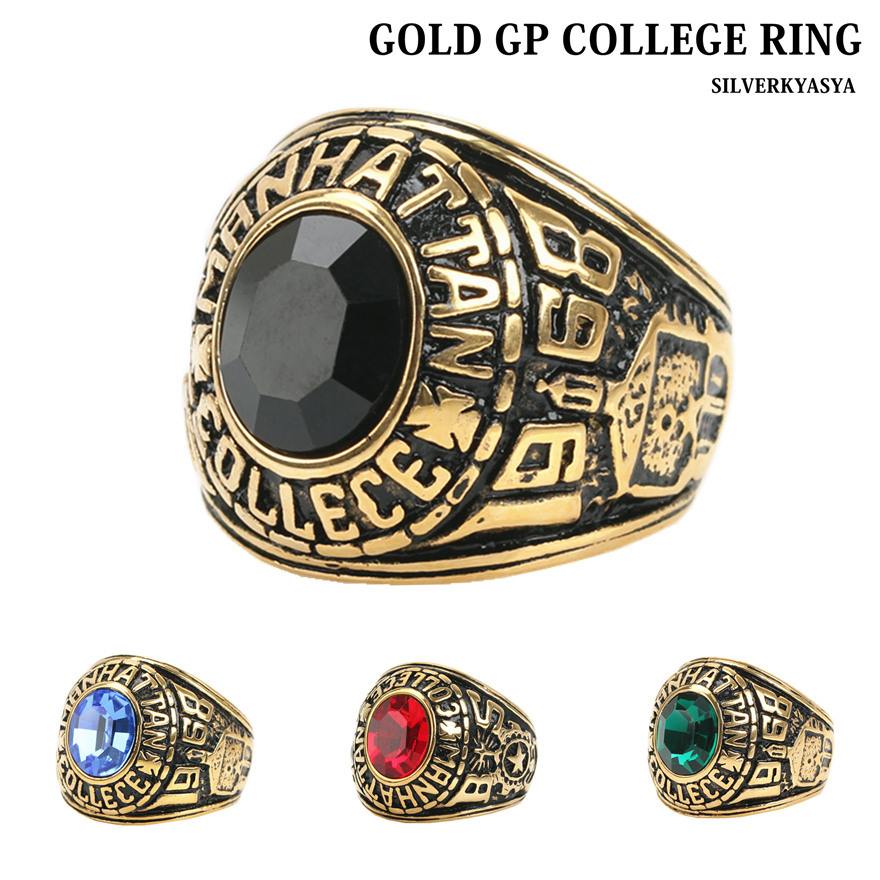 - (グリーン、19号) ステンレス ゴールド カレッジリング 指輪 大粒 ストーン ブラック レッド ブルー グリーン