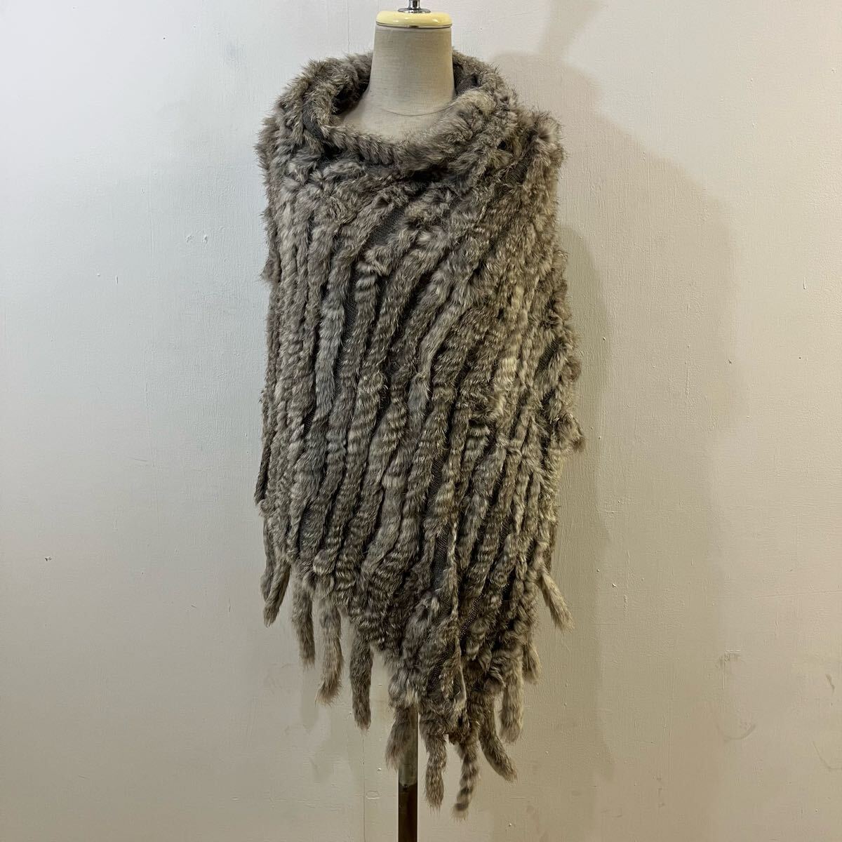 > 極上 本毛皮 フランス製 ラビットファー 毛皮ポンチョ プルオーバーパーカー フード 毛皮パーカー フリンジ 希少【送料一律/同梱可能】T