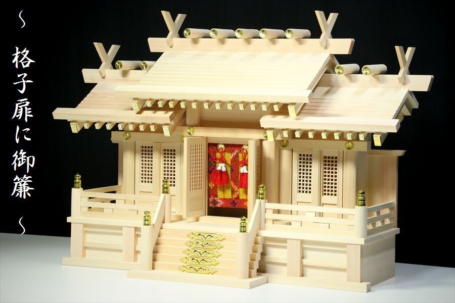 - 三社 ■ 屋根違い 格子扉■■ 後白河 ■■ 中型 ■神棚 単品 美しい御簾 ■ 岐阜県産 東濃ひのき製 ■ 国産 桧