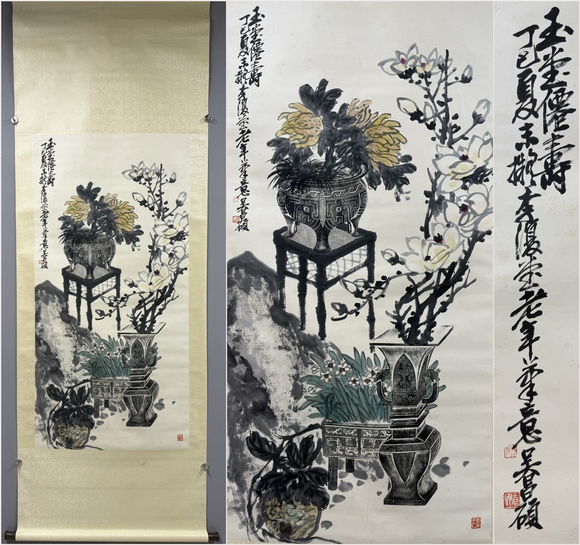 - 古美術 掛け軸 中国・近現代 「呉昌碩書」 紙本 【玉堂仙寿図】 立軸 書道 巻き物 肉筆保証 唐物 古画 LT-250227