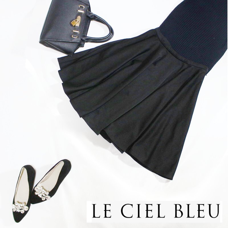 > 美品 ルシェルブルー LE CIEL BLEU 合物 シンプル 秋 冬 ほんのり艶 ストレッチ ジャージ― ボリューム フレアスカート 38 9号 ブラック