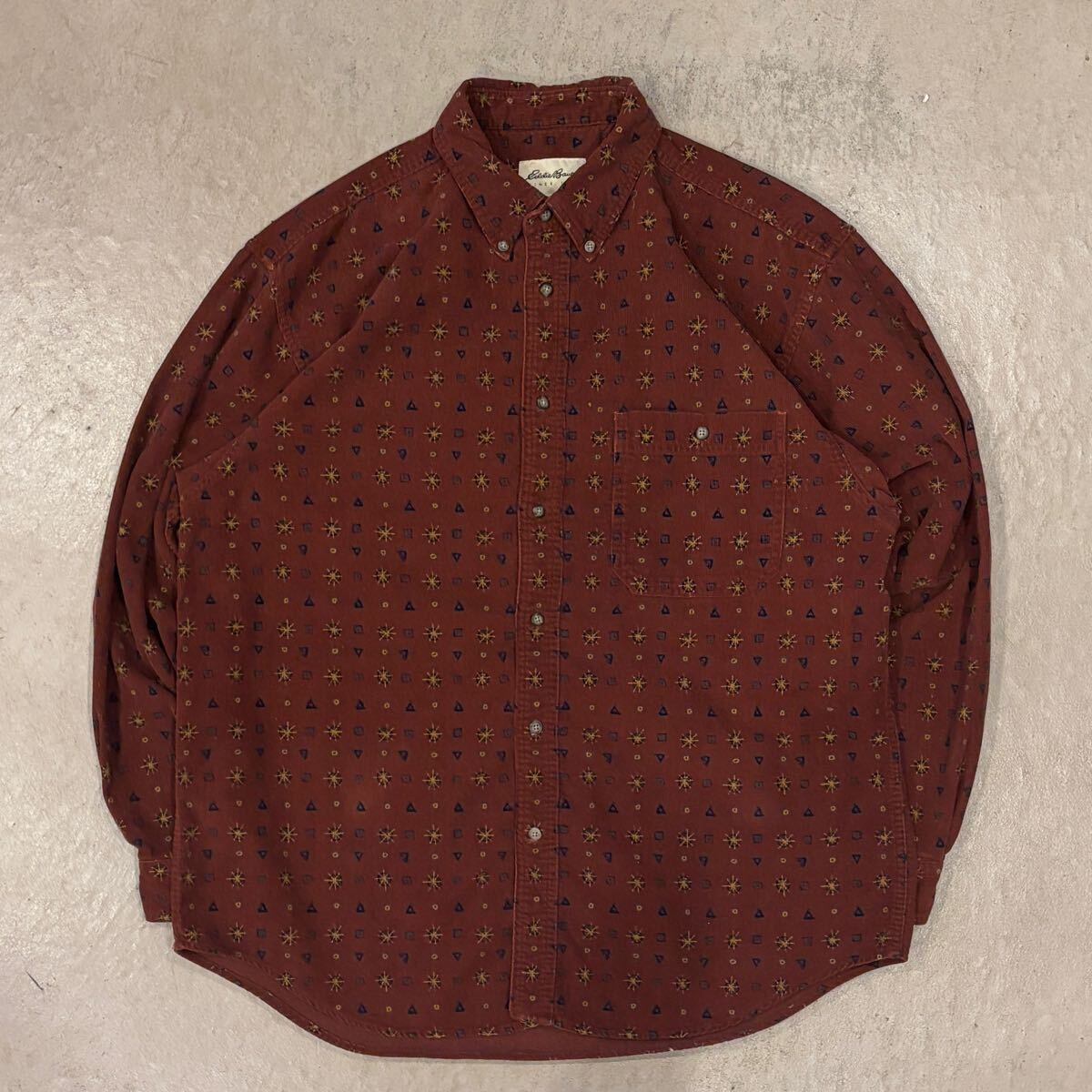 > 【90s】00s Eddie Bauer エディーバウアー 長袖 ボタンダウン コーデュロイシャツ メンズ L 茶/ブラウン 細畝 総柄 コットン vintage 正規