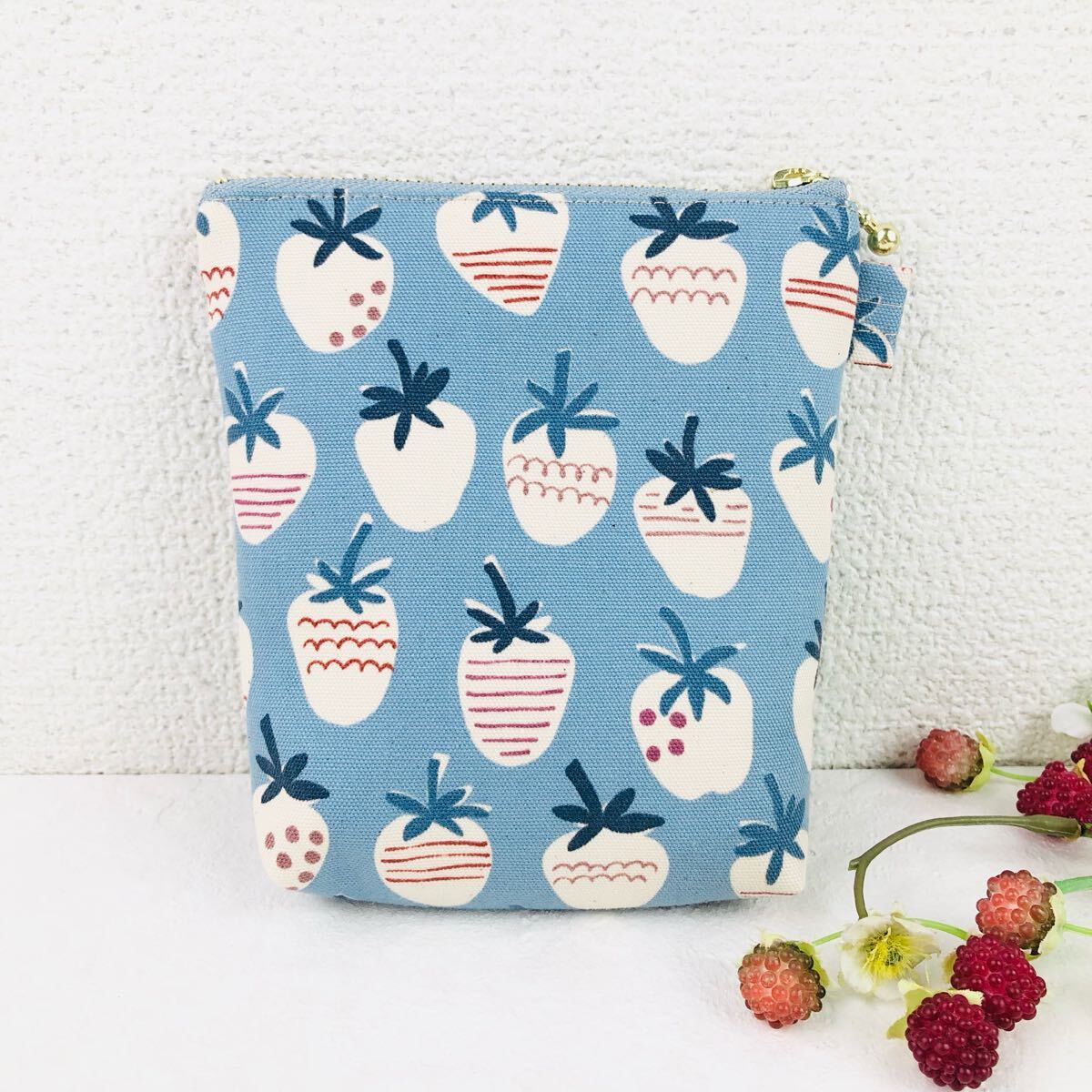 - 可愛いいちごのファスナーポーチ ハンドメイド タバコポーチ サニタリーポーチ コスメポーチ くすみブルー アイコスポーチ