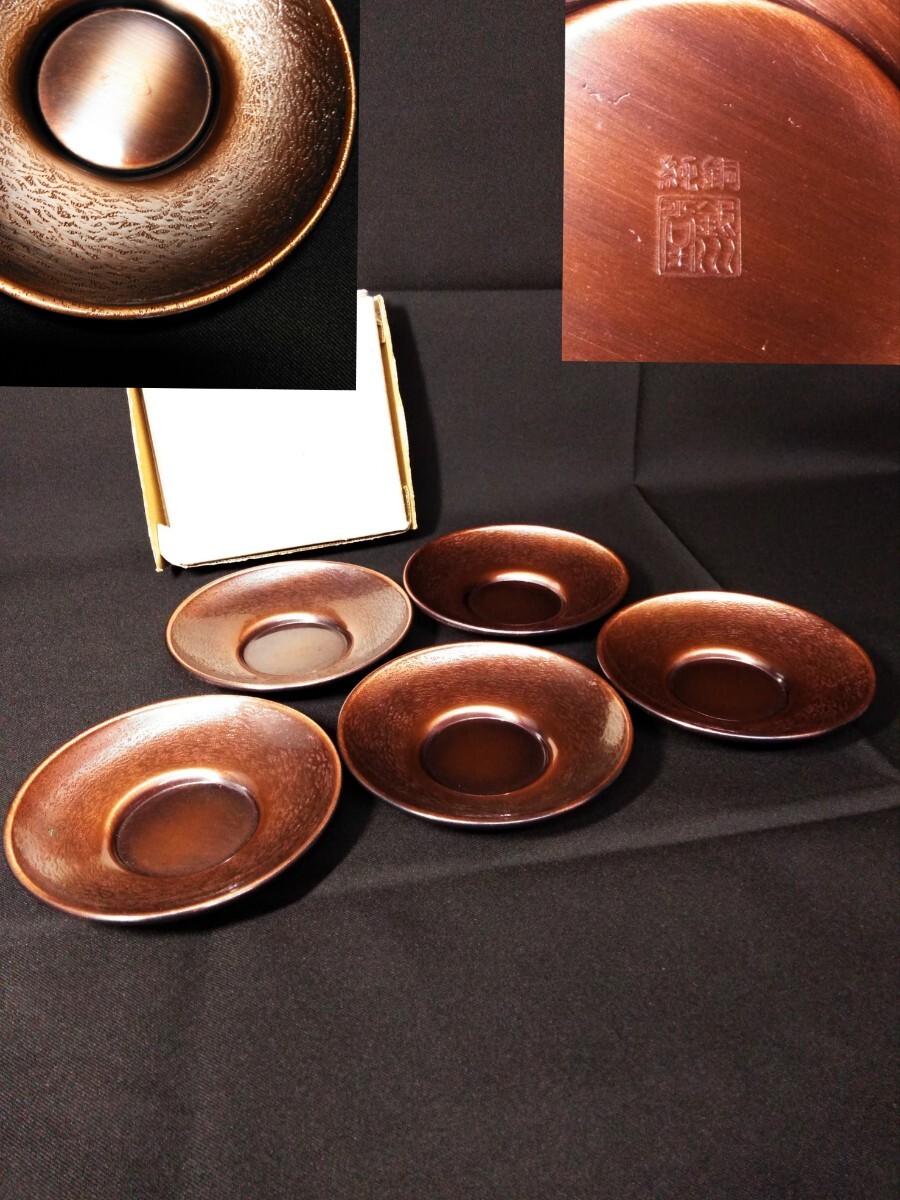 - 純銅 銀川堂 茶托 五客セット 茶器 銅製 金属工芸 茶道具 在印 (検索) 工芸 美術 骨董 古玩 コースター 会席 懐石 茶会 茶の湯 受皿 茶台