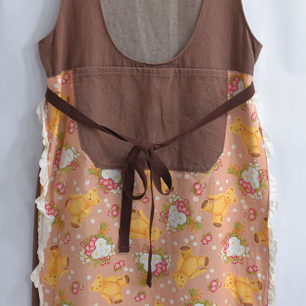 - Used 切り替えデザイン デニム エプロンワンピース コットン ジャンスカ クマ総柄 レース ヴィンテージ ブラウン レトロ ビ