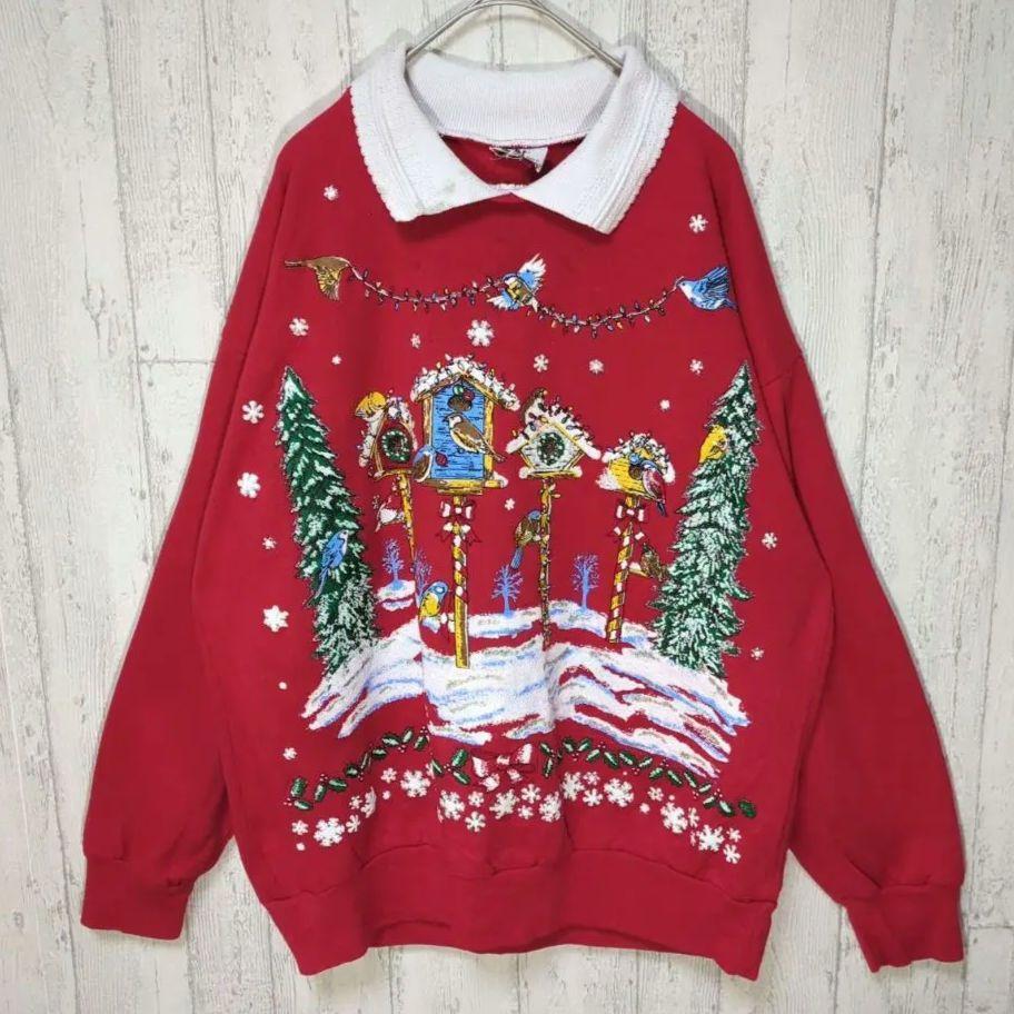 - 襟付きスウェット ビンテージ古着 USA クリスマスカラー バード #h840