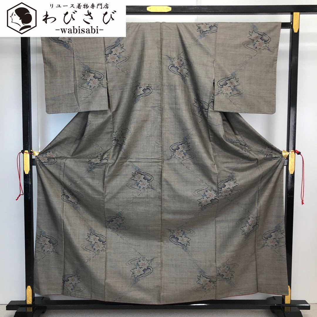 - 本場大島紬 茶泥染 カタス7マルキ 流水に百合の花模様 K-4392 着物 きもの kimono 和服 和装 中古 リサイクル着物 【送料無料】
