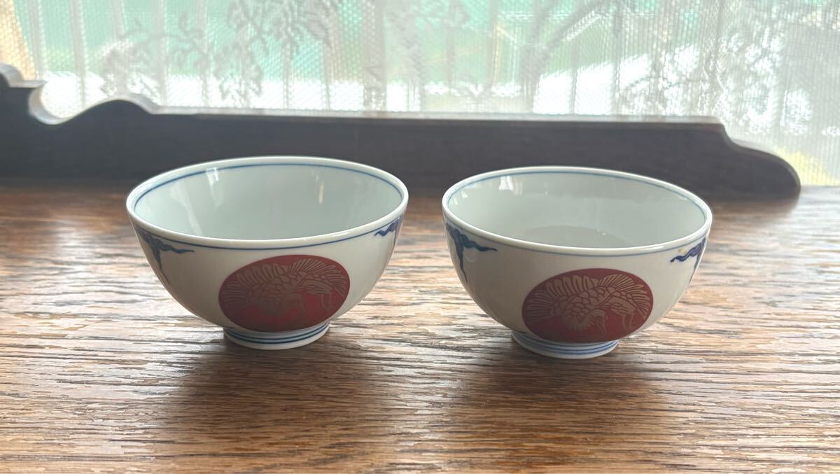 - 鶴絵 汲み出し碗 京焼き 金彩日の出 金彩鶴 湯呑み 夫婦湯呑み 2客 松竹梅 小鉢 未使用自宅保管品