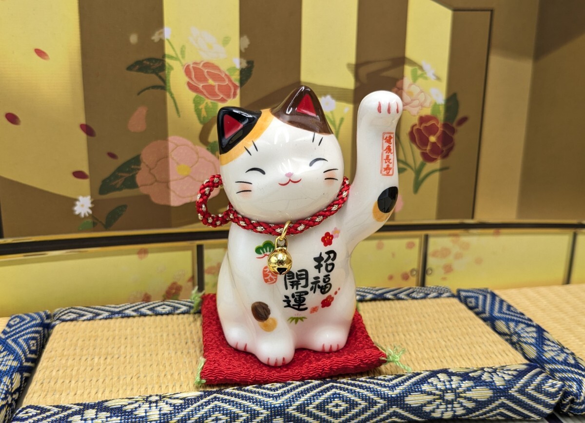 - 縁起物 招き猫 陶器 彩絵 招福開運招き猫 鈴付 小 左手上げ
