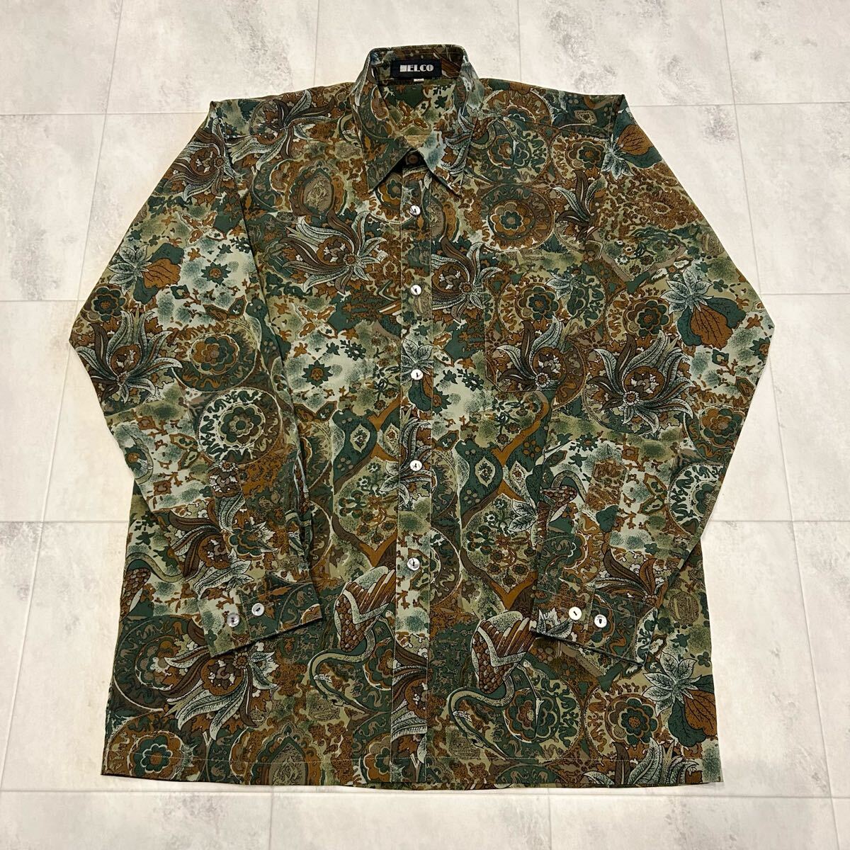 - ELCO 総柄 柄シャツ 花柄 和柄 レトロ アート ビンテージ 長袖シャツ ポリエステル100%