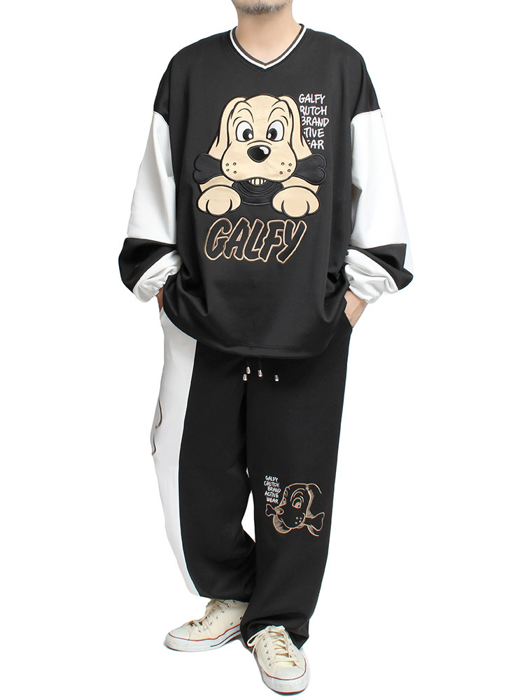 > 【新品】 中型犬 ブラック GALFY(ガルフィー) セットアップ メンズ ロゴ 刺繍 プリント ジャージ Vネック カットソー イージーパンツ