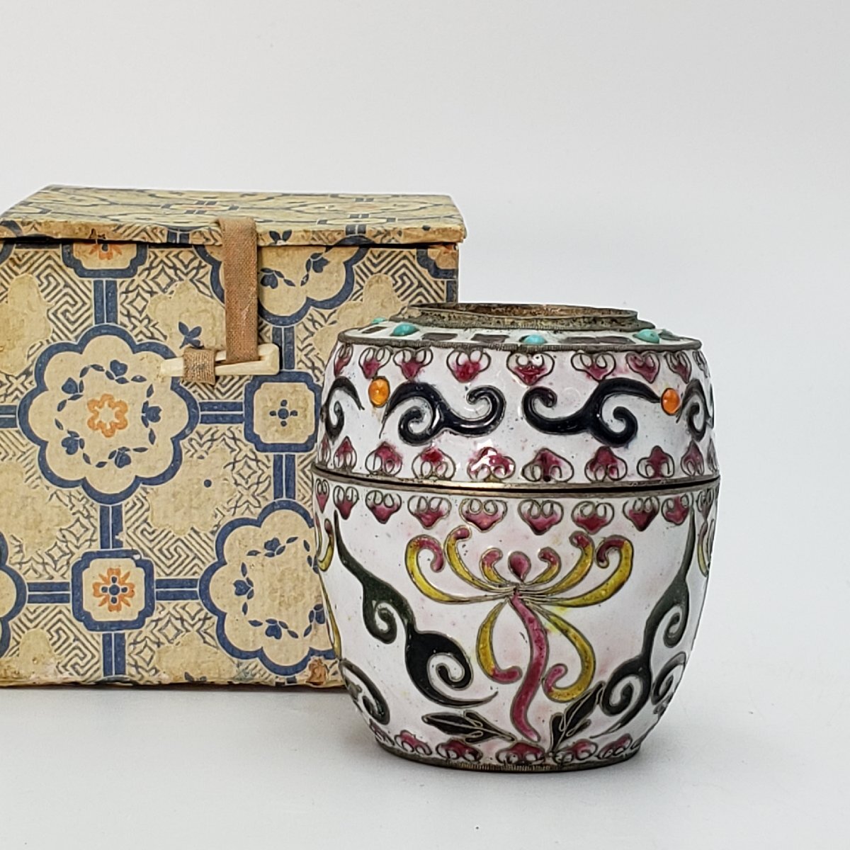 > 七宝焼 小物入れ 唐物 銀製 琺瑯彩 蓋物 玉石象嵌 金属工芸 古美術 紙箱付 華道具 茶道具時代物 古道具 アンティーク 小道具 【60e2473】