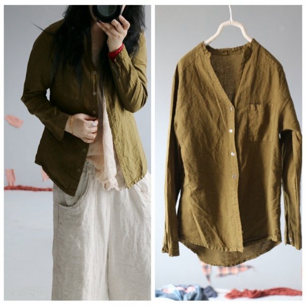 - jm ワイシャツ 純色 Vネック 柔らかな素材 楽な着心地 軽やか 麻100% ゆったり ダル タフ ピクルスグリーン