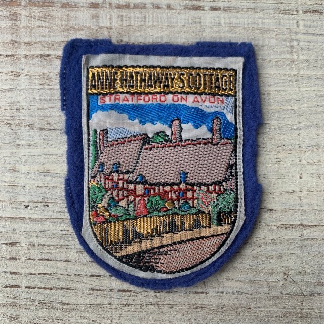 > 【7.0㎝×5.5㎝】STRATFORD UPON AVON イギリス フェルト×刺繍ワッペン 青■ビンテージ オールド ヨーロッパ古着 雑貨 パッチ